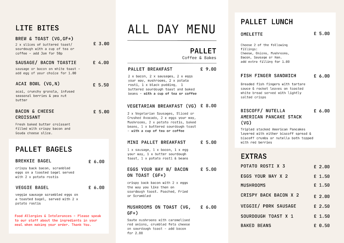 Let’s talk about the food, which is undoubtedly a focal point of the café. The menu serves up an array of mouthwatering options for breakfast. Picture this: the Pallet Breakfast, a hearty platter featuring 2 crispy bacon rashers, juicy sausages, and 2 eggs cooked just how you like them, all complemented by golden potato rostis, savory mushrooms, flavorful black pudding, and a buttered slice of sourdough toast. This delightful feast is not just filling; it’s truly one of the best breakfasts you can find! Vegetarians aren't left out either—try the Vegetarian Breakfast, abundant in flavor with veggie sausages, avocado, and all the same delightful sides. Each plate is not only generous in portion but also a visual delight.